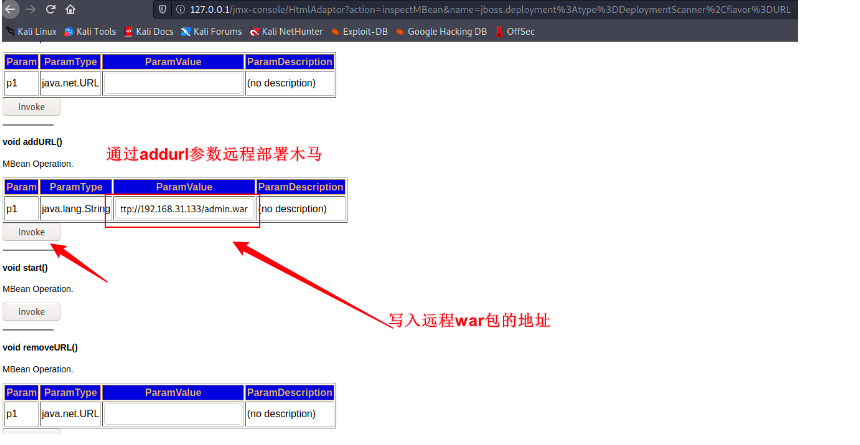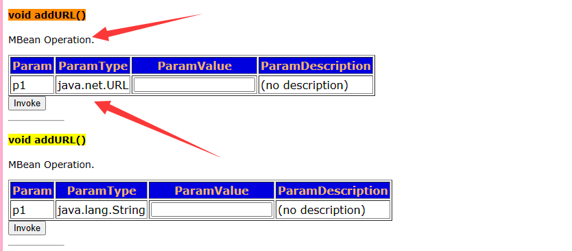 搜索 void addURL() 这里并且 ParamType 参数为 java.net.String 才是我们需要的,在它的右边就是填写远程的 war 包地址,上面的则是 Webshell 地址