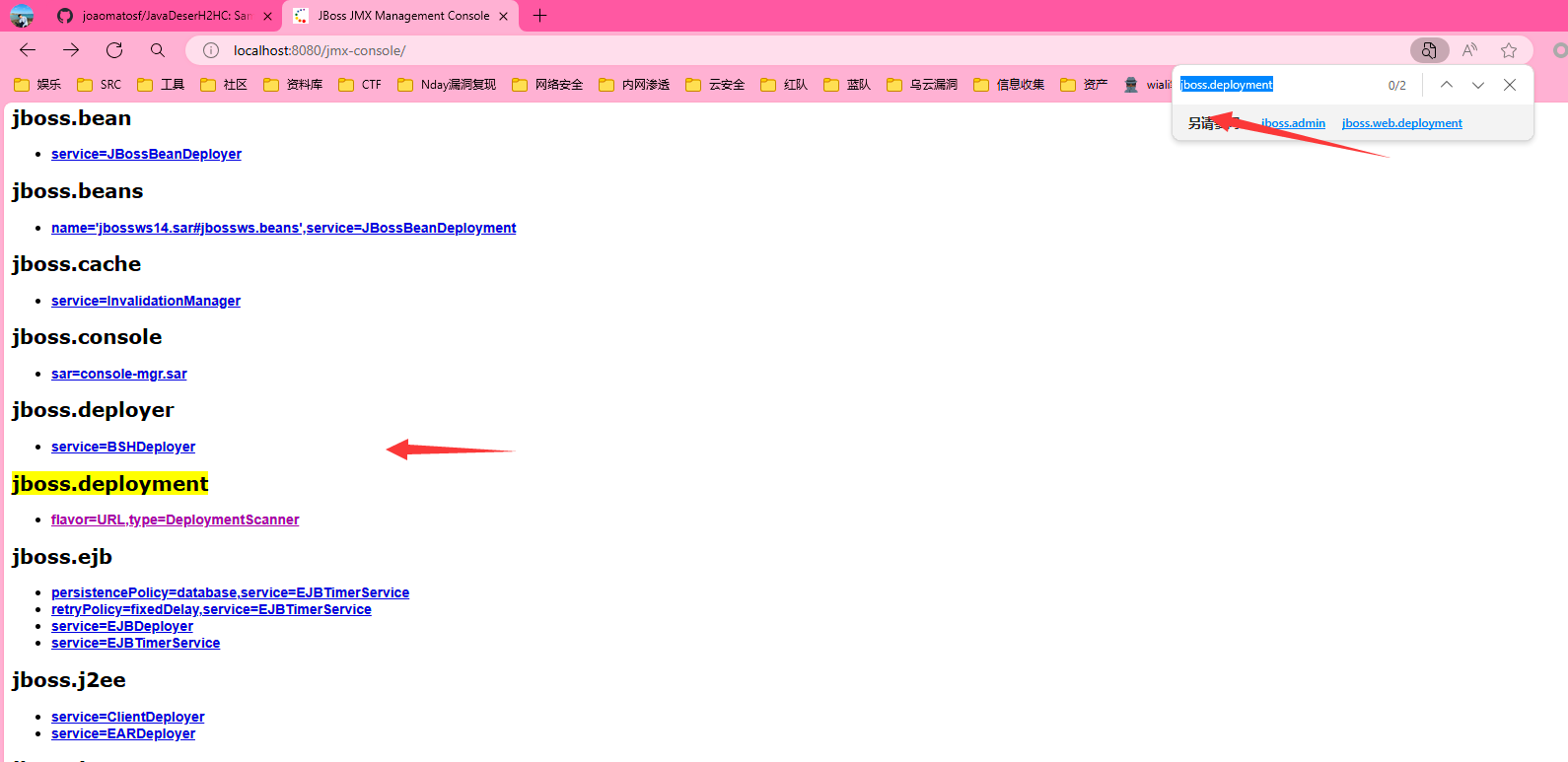 进入控制台搜索 jboss.deployment war 部署,在这里写入本地的恶意 war 包地址