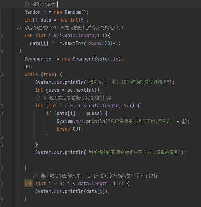 定义一个动态初始化的数字 存储 5 个随机的 1-20 之间的数据并存入数组中
