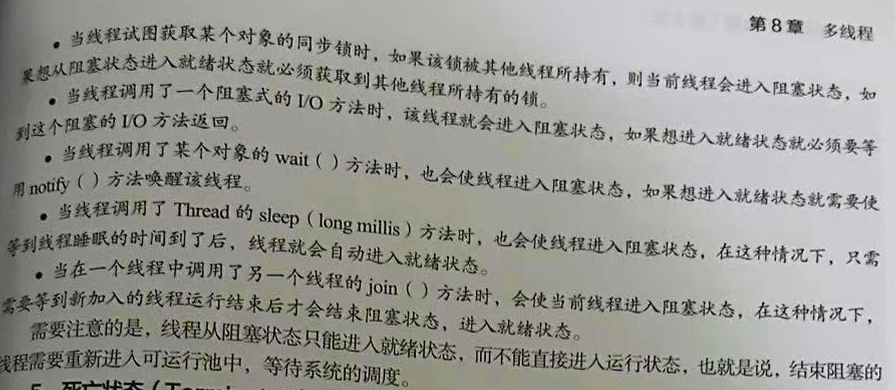 权,并暂时终止自己的执行,进入阻塞状态,线程进入这个状态后,就不能进入排队队列,只有当引起阻塞的