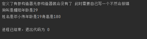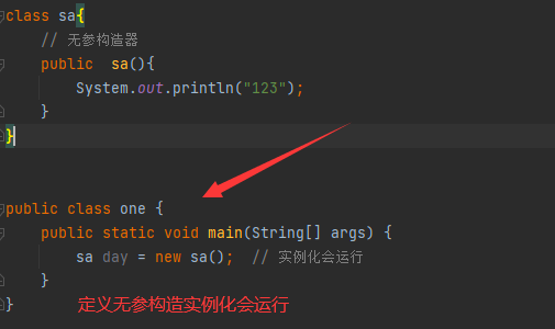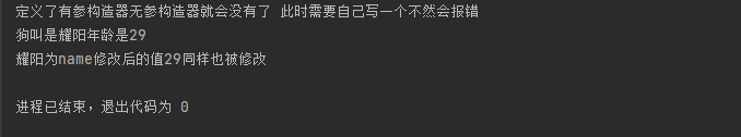 1 2 3 4 5 6 7 8 9 10 11 12 13 14 15 16 17 18 19 20 21 22 23 24 25 26 27 28 29 30 31 32 33 34 35 36 37 实例代码 直接复制学习 注意事项: 一旦定义了有参数构造器 无参数构造器就没有了 此时需要自己写一个 不然会报错,但其实只要没有new 出无参的构造器就没有事情 会报错只是我们简单的new 出了它, saber s = new saber () 但我们没有在类中写无参的方法,所以才会导致报错 class sa { private String name ; private int age ; public sa () { System.out.println("定义了有参构造器无参构造器就会没有了 " + "此时需要自己写一个不然会报错" ); } public sa (String a,int b) { name = a; age = b; System.out.println("狗叫是" +a+"年龄是" +b); } public void saber () { System.out.println(name+"为name修改后的值" +age+"同样也被修改" ); } } public class one { public static void main (String[] args) { sa day = new sa (); sa day1 = new sa ("耀阳" ,29 ); day1.saber(); } }