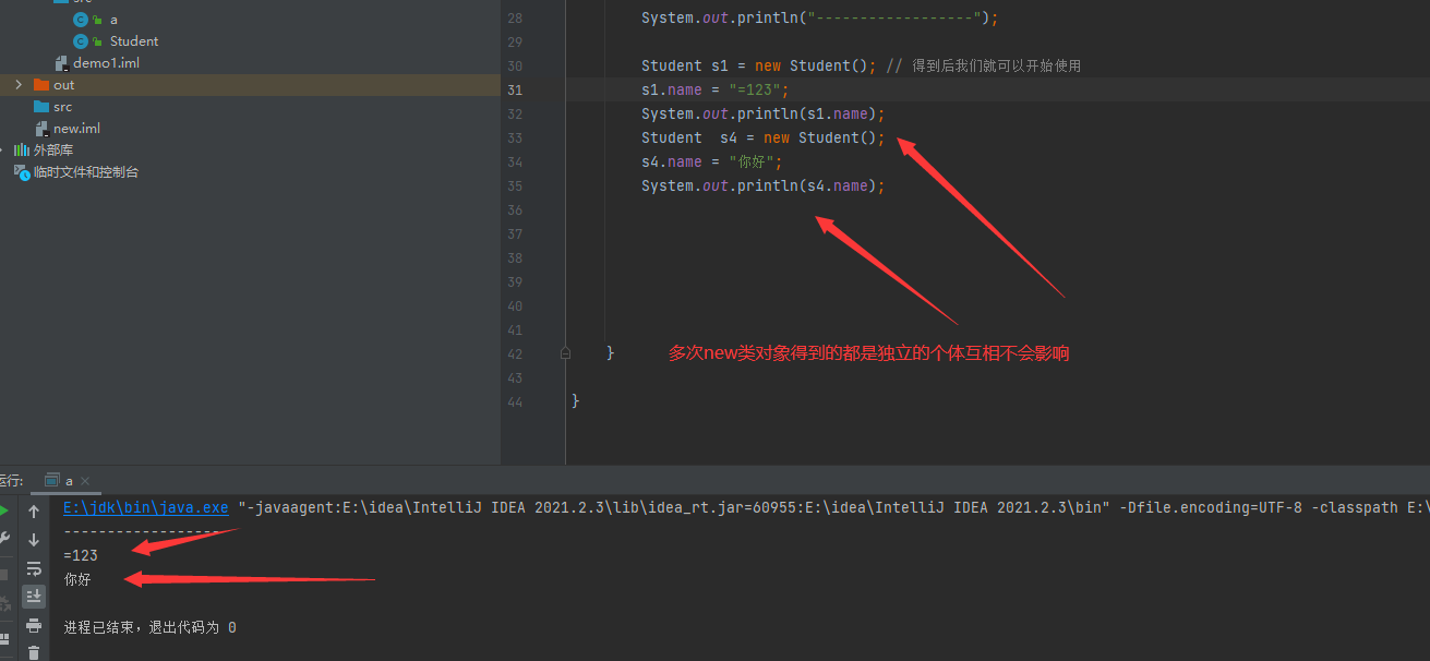 1 2 3 4 5 6 7 8 9 10 11 12 13 14 15 16 17 18 19 20 21 public class a { public static void main (String[] args) { Student s1 = new Student (); s1.name = "你好" ; s1.pce = 1 ; s1.age = 2 ; s1.kali(); Student s2 = s1; s2.name = "世界" ; s2.pce = 3 ; s2.age = 4 ; System.out.println("-----------------" ); System.out.println(s1.name); System.out.println(s2.name); s2.kali(); } }