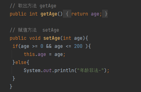 1 2 3 4 5 6 7 8 9 10 11 12 13 14 15 16 17 18 19 20 21 22 23 24 25 26 27 28 29 30 31 32 33 34 35 36 37 38 39 40 41 42 43 44 45 实例代码 直接复制学习 class Studen { private String name ; private int age; public int getAge () { return age; } public String getName () { return name; } public void setName (String name) { System.out.println("值为" +name); } public void setAge (int age) { if (age > 18 ){ this .age = age; System.out.println("是一个未成年" +age); }else { System.out.println("不是未成年" +age); } } } public class a1 { public static void main (String[] args) { Studen sa = new Studen (); sa.setName("你好时间" ); sa.setAge(16 ); } } 输出为: 值为你好时间 不是未成年16