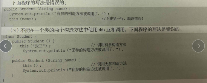 1 2 3 4 5 6 7 8 9 10 11 12 13 14 15 16 17 18 19 20 21 22 23 24 25 26 27 28 29 30 31 32 33 34 35 36 37 38 39 40 41 42 43 44 45 46 47 48 49 50 51 52 53 54 55 56 实例代码 直接复制使用 class Car { private String name; private double price; public Car(){ System.out.println("定义了有参构造器无参构造器就会没有了 " + "此时需要自己写一个不然会报错" ); } public Car(String name,double price){ this (); this .name = name; this .price = price; } public void goWith(String name){ System.out.println("this.name为" +this .name+"普通name为" +name); System.out.println(this ); } public void demo(){ System.out.println("我是" +name+"年龄" +price); } public void test(){ } } public class one { public static void main(String[] args) { Car c = new Car("李白" ,50 ); c.goWith("宝马" ); c.demo(); } 注意点: 1. 只能在构造方法中使用this 调用其他的构造方法,不能再成员方法中通过this 调用2. 在构造方法中使用this 调用其他构造方法必须处于第一行且只能出现一次输出: 定义了有参构造器无参构造器就会没有了 此时需要自己写一个不然会报错 this .name为李白普通name为宝马Car@1 b6d3586 我是李白年龄50.0