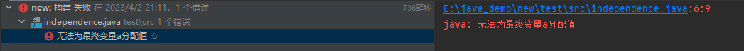 ------------------------------ 编译报错,在对 a 变量进行二次赋值编译器报错。 被final修饰的变量不能修改。