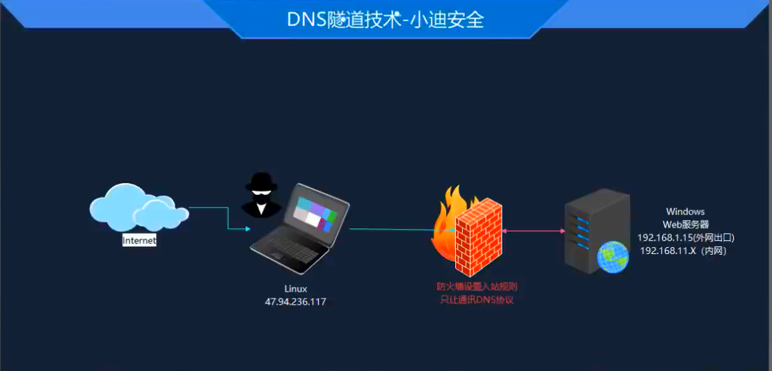 DNS 通讯在 Linux 直接可以使用,开放的端口是 53, 如果是 win 则需要下载东西,建立通信也是为了上线,可以更方便的传输数据,拖取数据,但是 DNS 隧道通信意义不大,可以上线 shell 何必通信