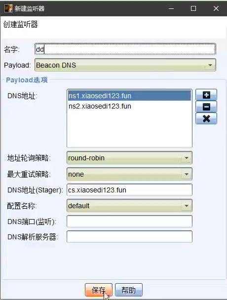 CS 创建监听器 Paylao 是 DNS 协议,地址写入 DNS 地址 ns1.saber.fun 并解析的地址为 cs.xiaodi.com 地址又还原成我们的 IP 地址,等于转换了