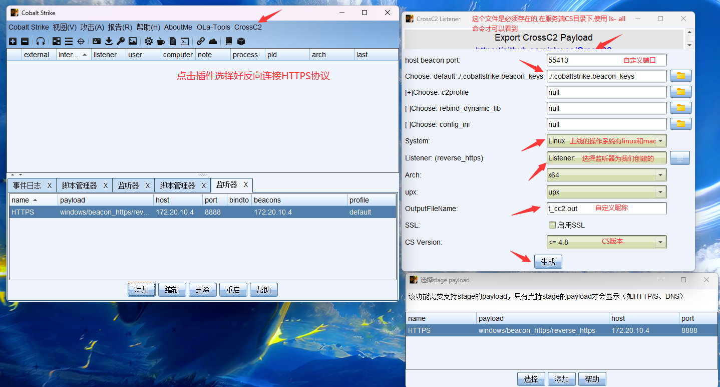 1 | cs45/ root/cs45/genCrossC2.Linux 服务端IP 5555 ../.cobaltstrike.beacon_keys null Linux x64 t_cc2.out |
