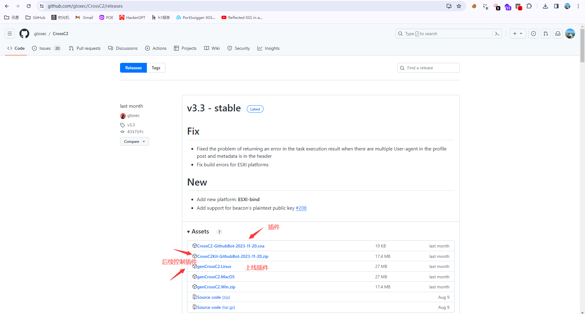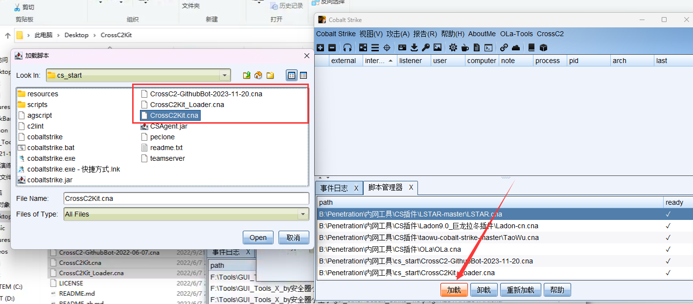 压缩包和下载的文件会有 3 个 cna 后缀为插件,开启 CS 逐步加载插件在客户端, genCrossC2.Linux 放置到服务端 Kali 目录下,加载完成菜单栏就会显示出插件版本支持