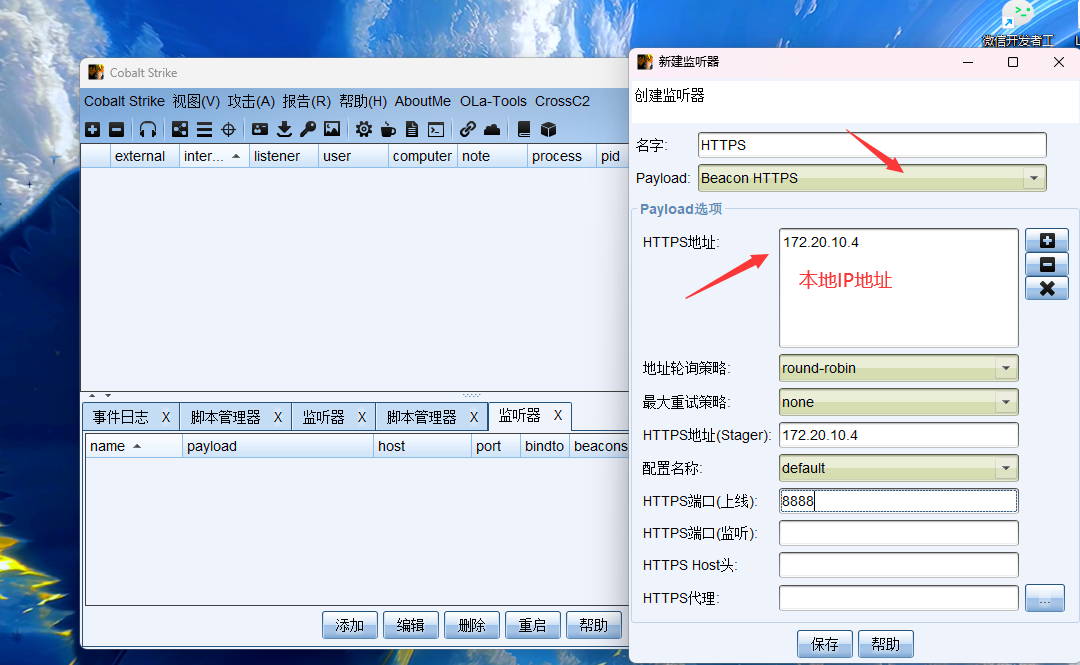 使用前创建一个监听器, Payload 为 HTTPS 协议,支持插件的反向连接,地址为本地