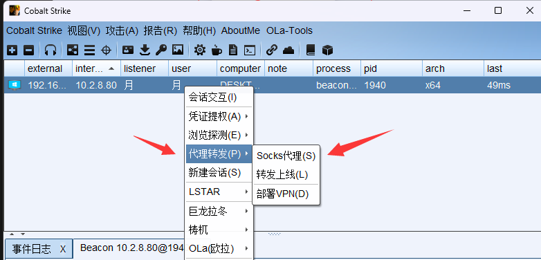 上线后右键代理转发 Socks 开放一个随机的端口,相当于在 CS 中建立了对于端口数字的节点
