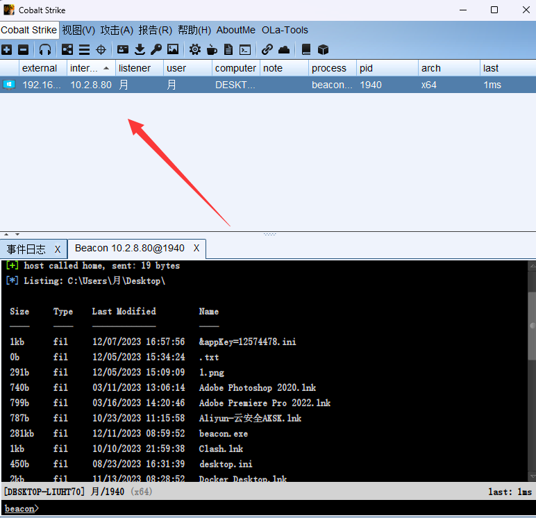 木马通过主机 2 建立的通讯,传输到主机 3 , 模拟主机 3 点击,回到 CS, 在上线的主机 2 中,选择会话交互,弹出窗口输入命令,操作和主机 1 连接主机 2 一致,让已经有 shell 的机器主动去连接暂时还没有 shell 机器