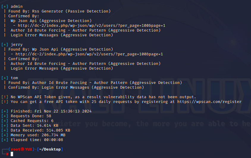 利用 kali 工具 WPScan 是针对这个系统制作的工具,利用它可以枚举此系统存在的出用户名