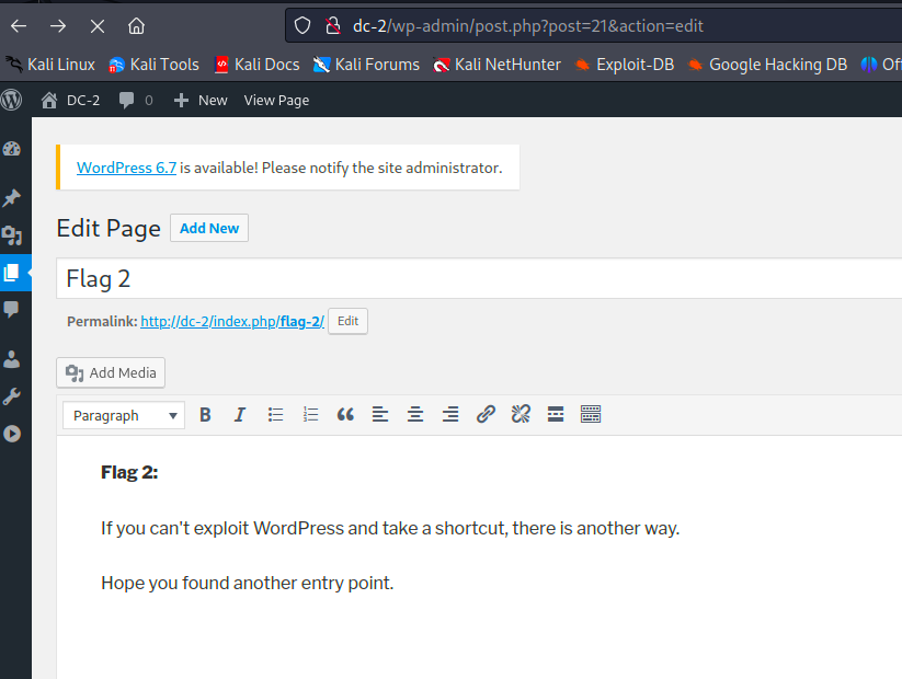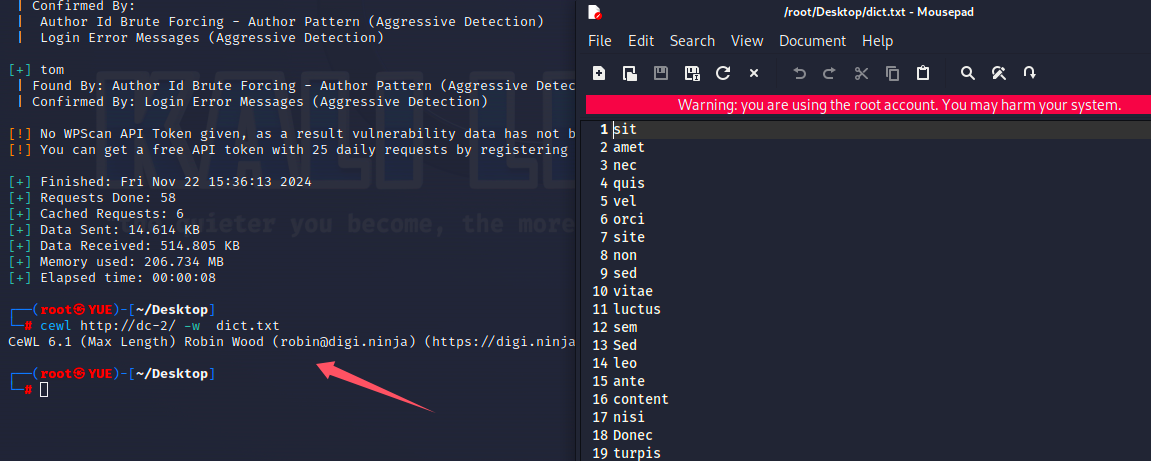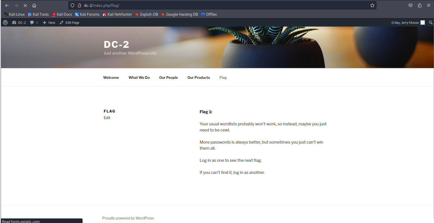 1 | cewl http://dc-2/ -w dict.txt # 密码保存在这里 |