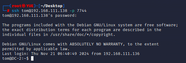 1 | ssh tom@192.168.111.138 -p 7744 # 默认端口不是22所以要重新选择 |