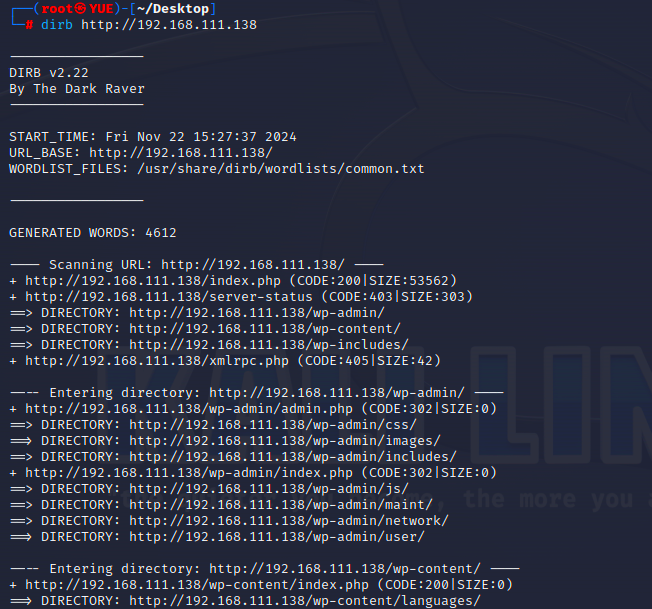 1 | dirb http://192.168.111.138 # 基本扫描 |
