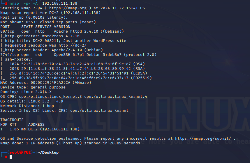 1 | nmap -p- -A 192.168.111.138 # -p-全端口 -A 综合扫描 |