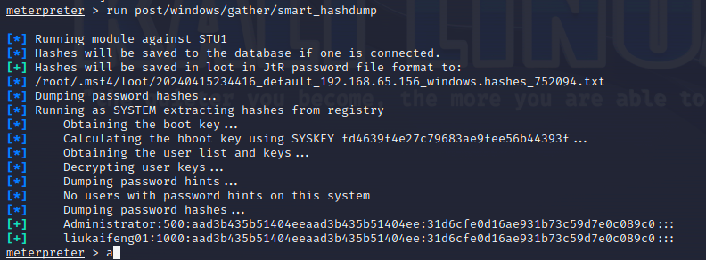 1 | run post/windows/gather/smart_hashdump // 提取命令 |