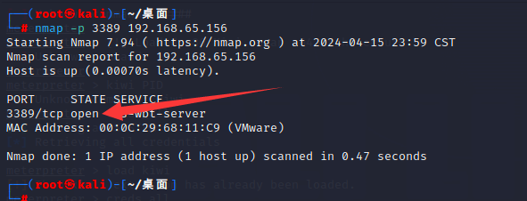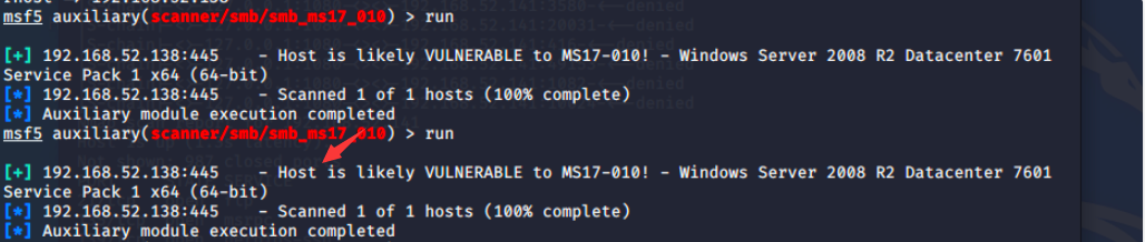 昨晚配置路由和 socks 之后正常是 kali 是可以接收到 52 网段的流量,然后使用 nmap 探测开放端口,会探测到 445 然后打永恒之蓝得到权限