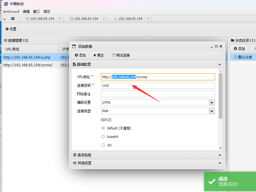访问网站前台马子上线,掏出蚁剑连接,取得 webshell