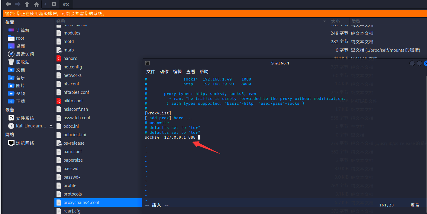 找到 proxychains4.conf 文件因为不会 vim 操作起来很不舒服,定位到端口位置,点击 x 后可以删除,点击 i 开始添加对应的端口号 和前文设置一致