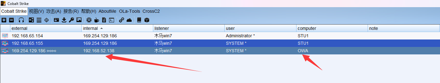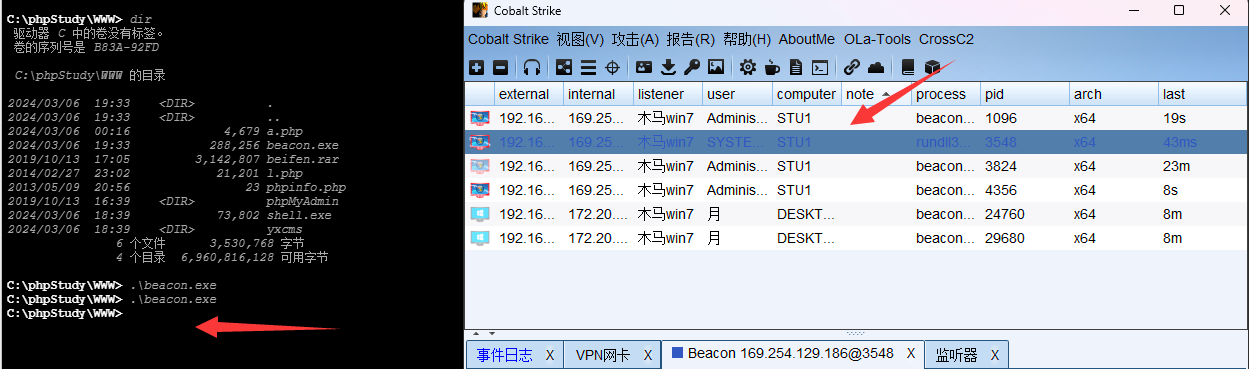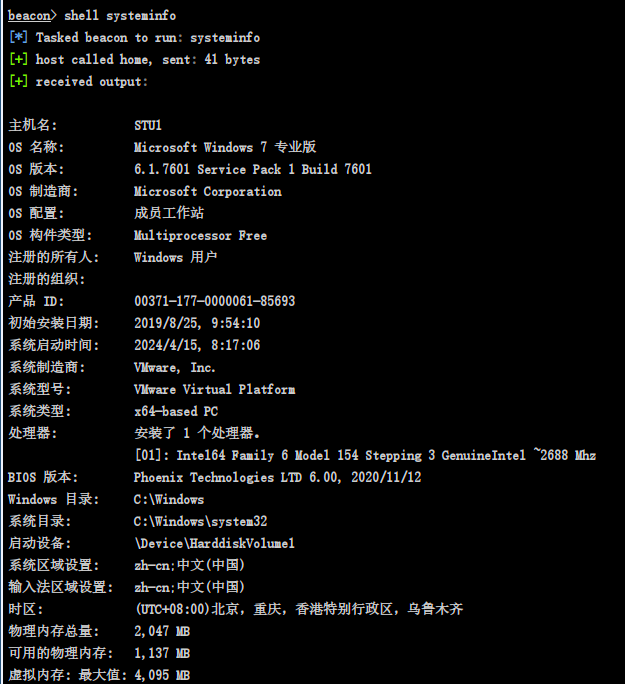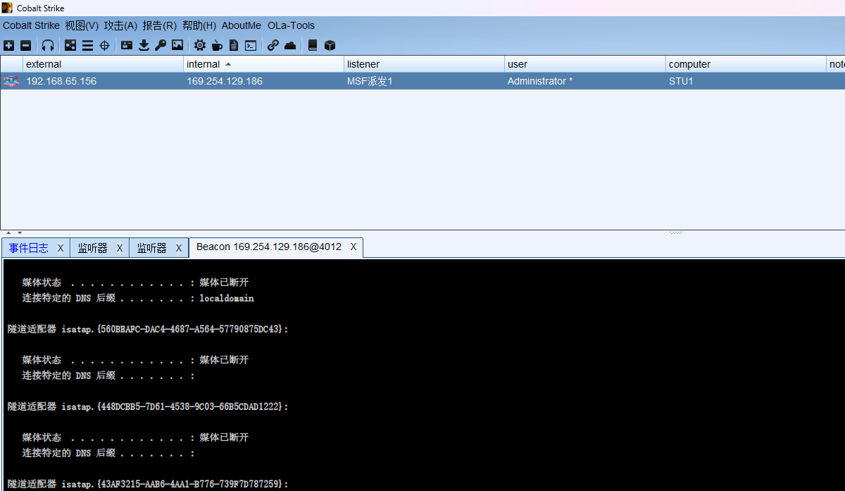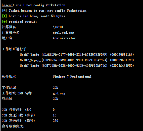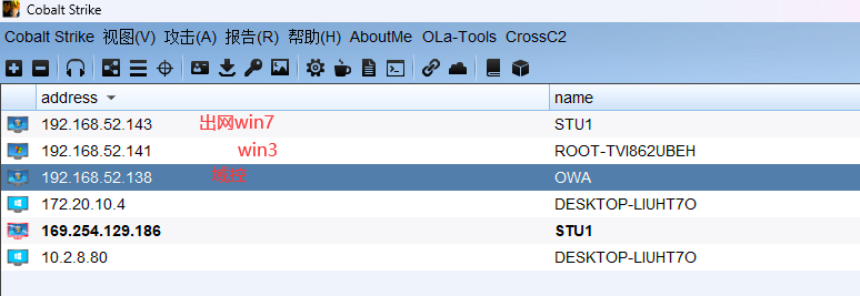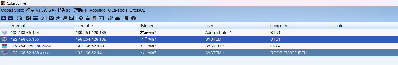 CS 生成非常简单,参考前文过程,生成的木马通过前文的蚁剑上传 win7 运行即可,上线,后续对 win7 信息收集和横向移动其他域内其他主机