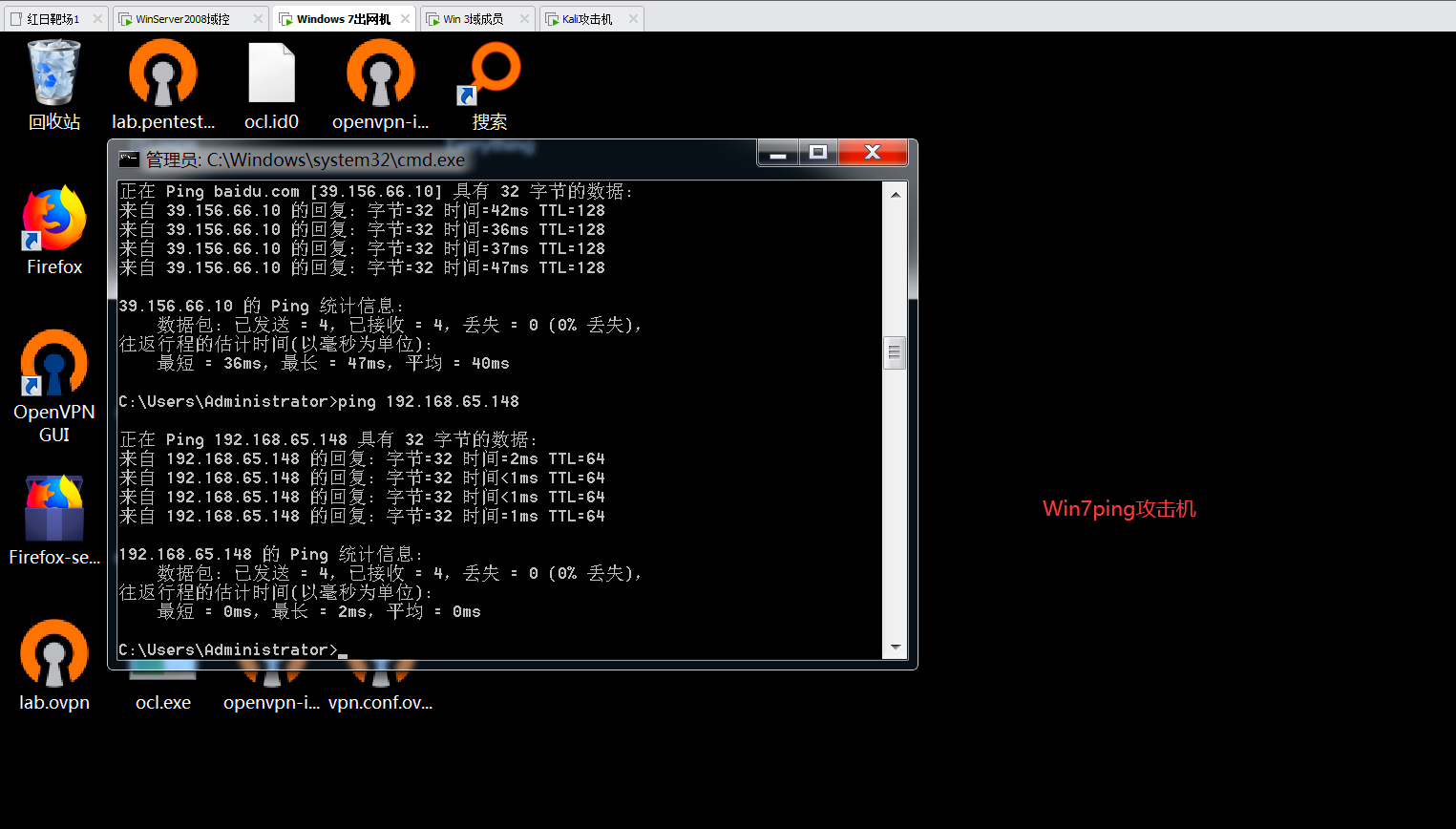 攻击机与 win7 可以互相 ping 通出网,如果出现 Ping 不同可能是 win7 防火墙未关闭或未开机