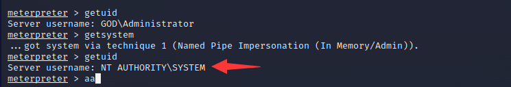 反弹 shell 后先查看当前用户,而后通过 getsystem 命令直接进行提权到系统权限