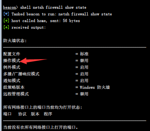 1 | shell netsh firewall show state // 查看防火墙状态是否开启,操作模式为禁用代表防火墙为关闭状态 |