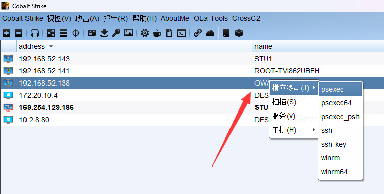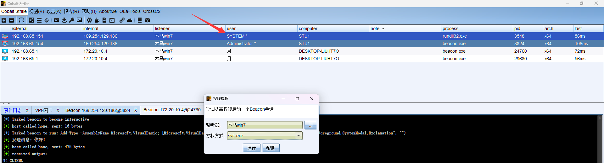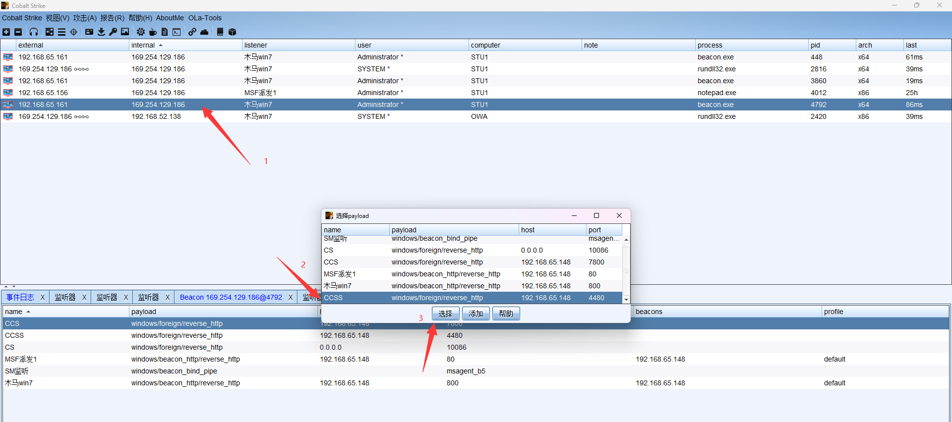 CS 在需要委派的权限主机右键新建会话,则选择新的监听器为我们创建的