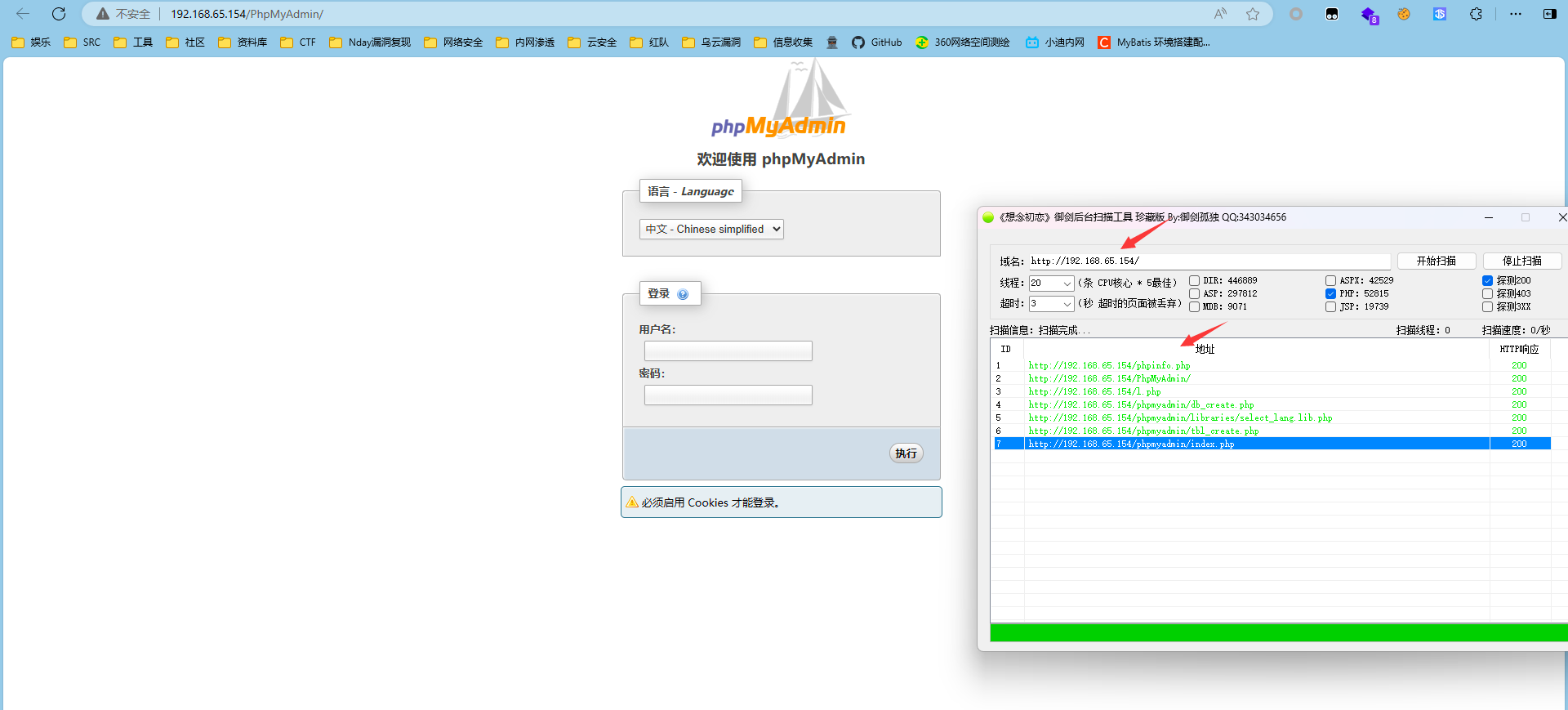 御剑目录扫描出数据库管理后台和 beifen.rar 文件路径