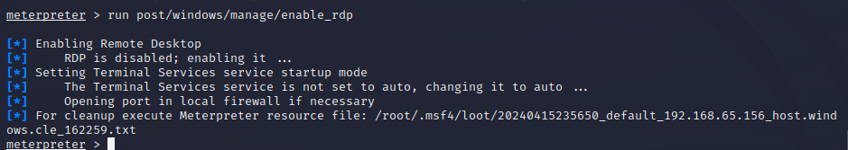 1 | run post/windows/manage/enable_rdp // 开启3389远程桌面 |