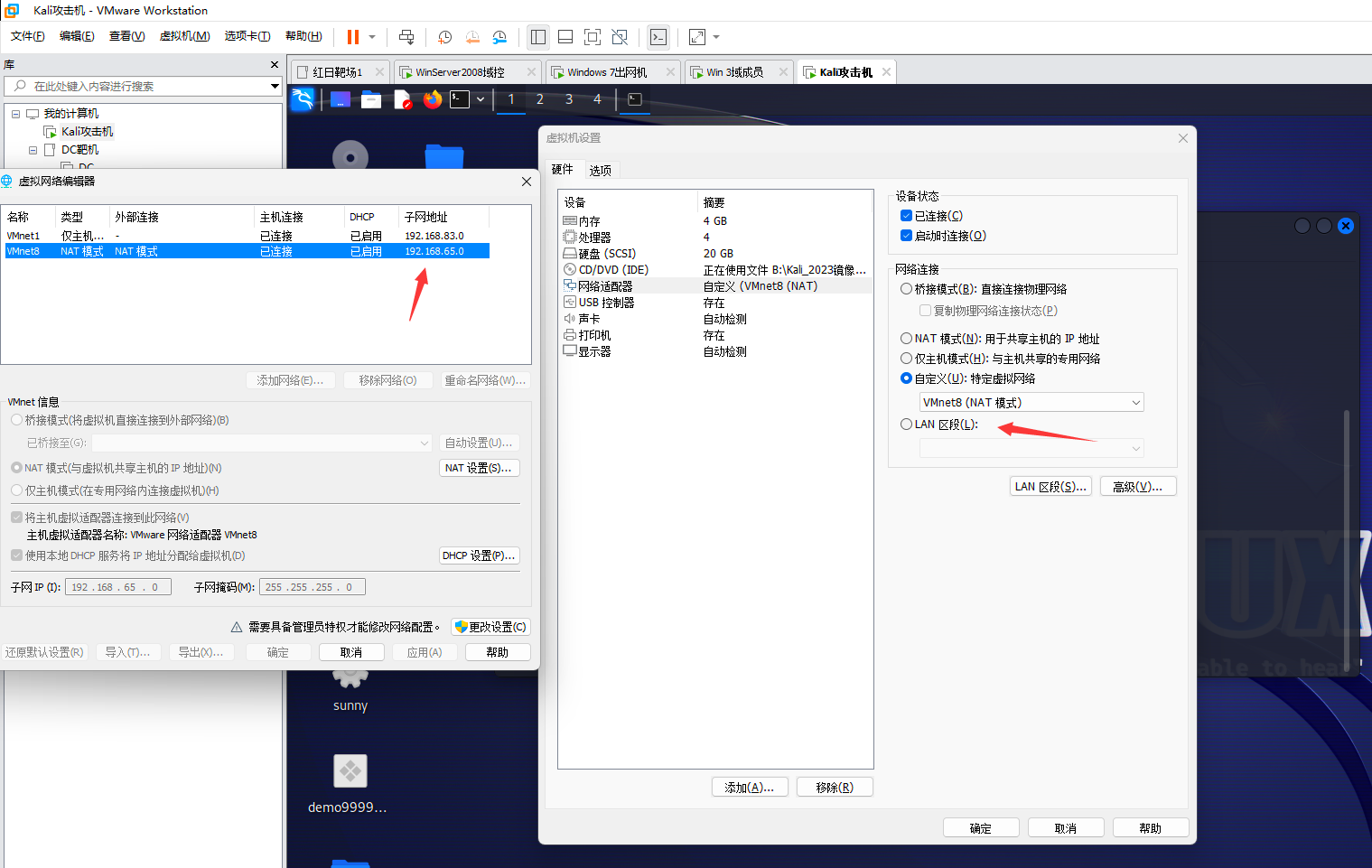 kali 地址网络适配器选择,为 VMnetNAT 模式会通过 DHCP 自动获取 IP, 本机 65 网卡会自动分配 IP 和靶机 win7 同网段