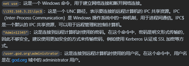 1 | net use \\ 192.168.3.21 \ipc$ " Admin12345 " /user.god.org\ administrator |