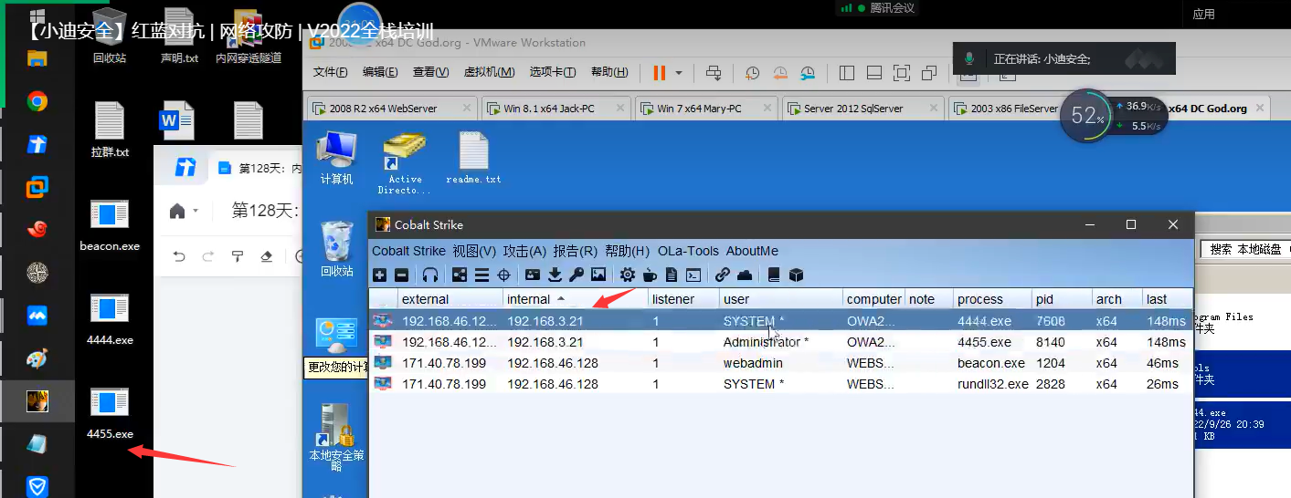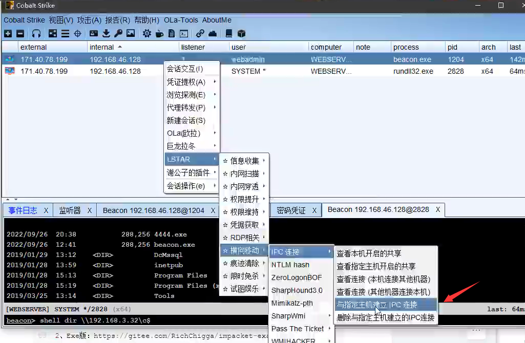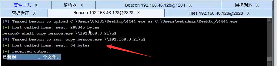 使用 IPC 远程登录计算机 445 139 端口以进行文件共享,但是域控不出网络,攻击机不能和 3.31 一样直接传木马连接,必须将木马传递至受控主机,通过该主机的通信先远程登录域控,再 copy 木马到目录下执行计划任务上线