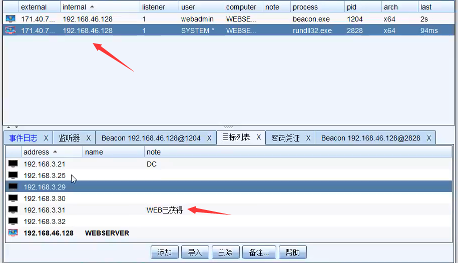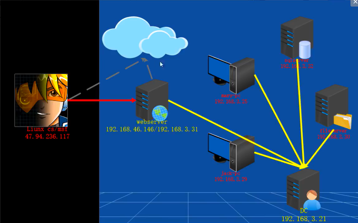 3.31 为已经获取权限的主机地址, 3.21 域控主机其余是内网环境下的其他主机,判断网络出网方式,获取权限的 3.31 , 但是木马信息上还是我们的地址,所以判断要么是不出网 or 限制出网协议某些协议能出去
