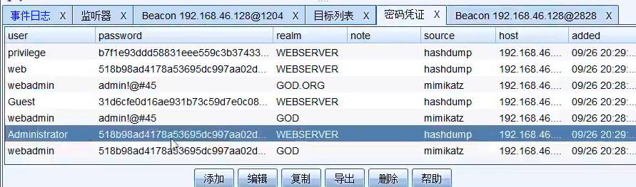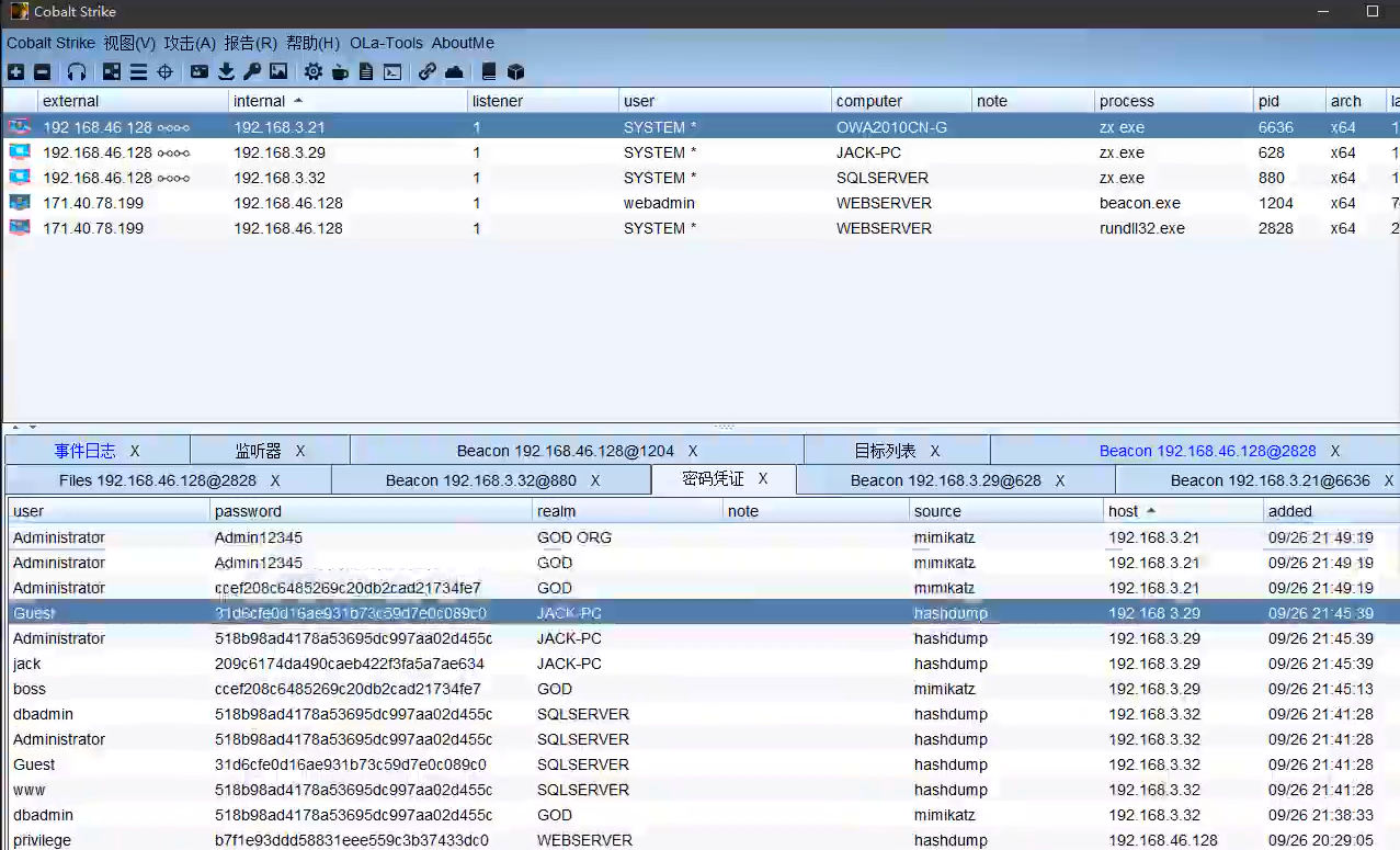 执行木马上线后上线主机继续抓取密码凭证再次进行横向移动,用账户秘密信对域内其他成员主机继续横向