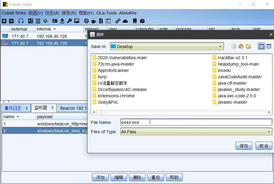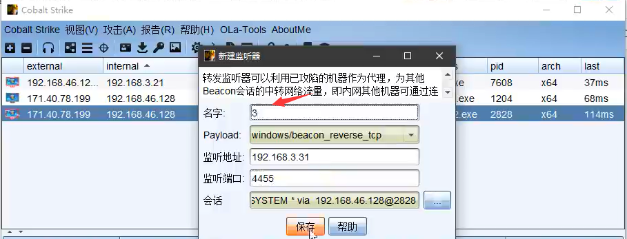 右键受控主机 3.31 转发上线会出现监听器模块,此监听器给到的木马流量会转发到攻击机,配置转发监听器木马的 Payload 选择为它就可以了,会生成反向连接木马
