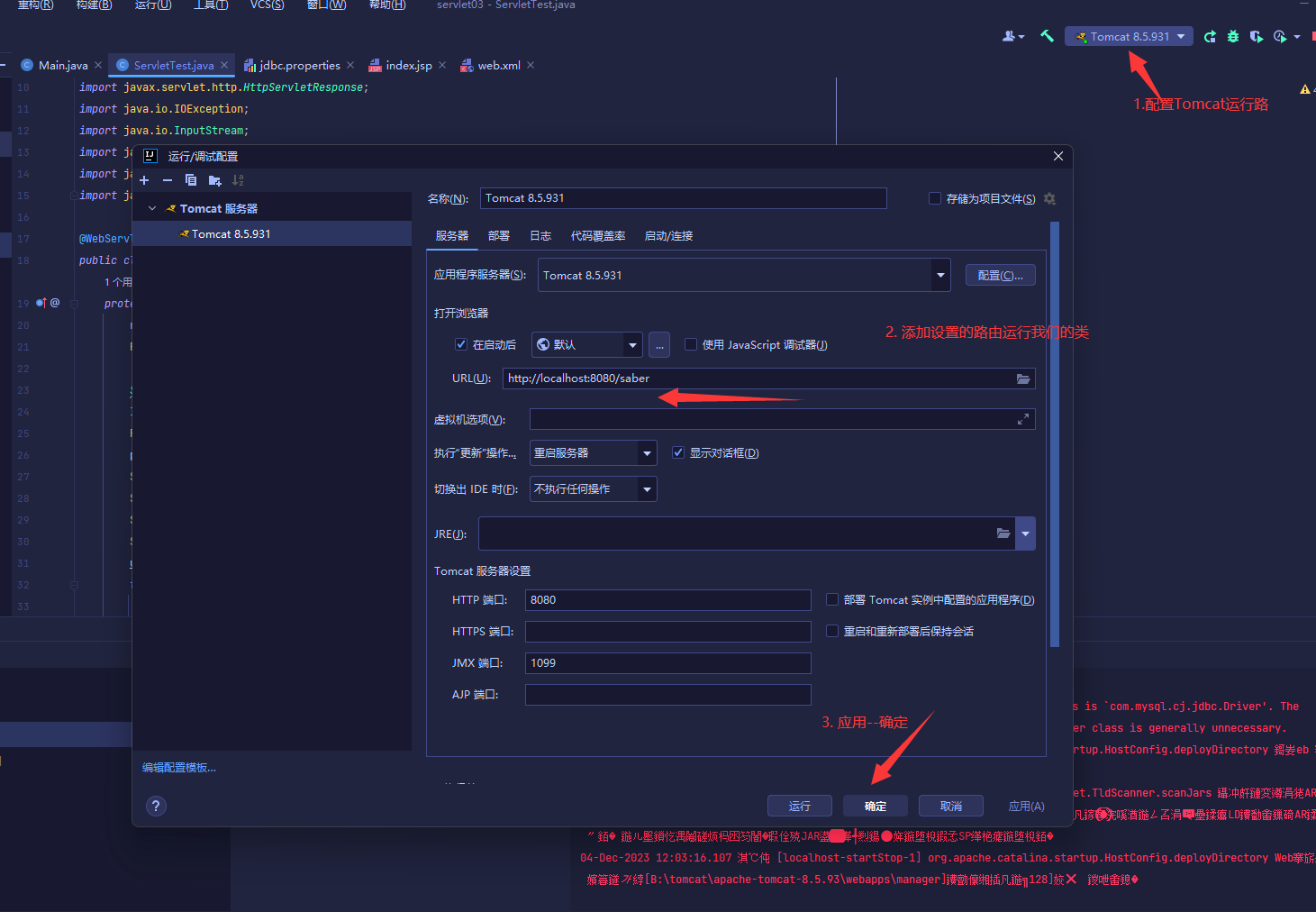 按照步骤配置 Tomcat 首次运行的路径,如果不做设置默认第一次会运行 index.JSP 文件,只需要在这里添加我们设置的 Servlet 类注解式的路由即可,配置完成运行